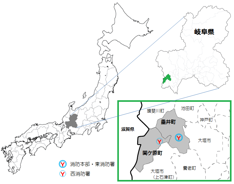 不破消防組合は岐阜県の西端部に位置し、垂井町、関ケ原町の2町により構成される不破郡を管轄する一部事務組合です。管轄面積106.37平方km、人口31,728人、世帯数13,395世帯(令和7年4月1日現在)となっています。